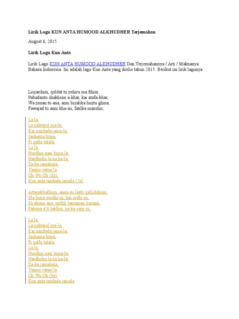 Doc Lirik Lagu Kun Anta Humood Alkhudher Dan Terjemahannya Dung Abdul Academia Edu