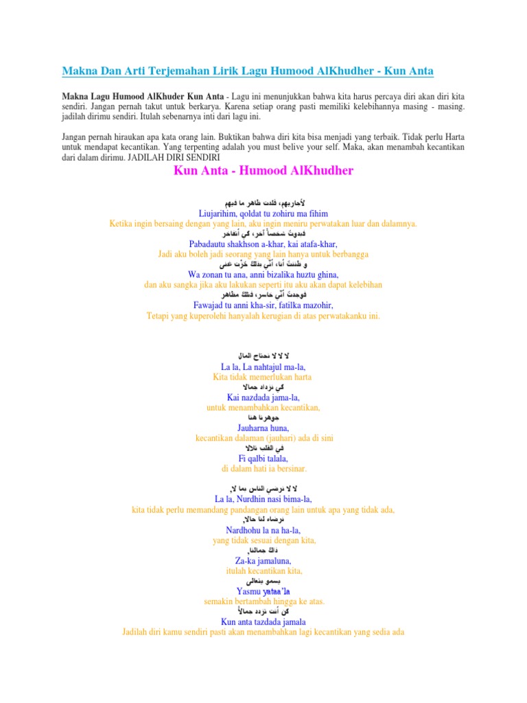 Lirik lagu kun anta arab latin dan terjemahannya. Berikut ini yang mungkin masih berkaitan dengan. 5 tips menulis lirik lagu dengan baik by admin posted on december 1 2016. Lirik kun anta latin oleh humood alkhudher.