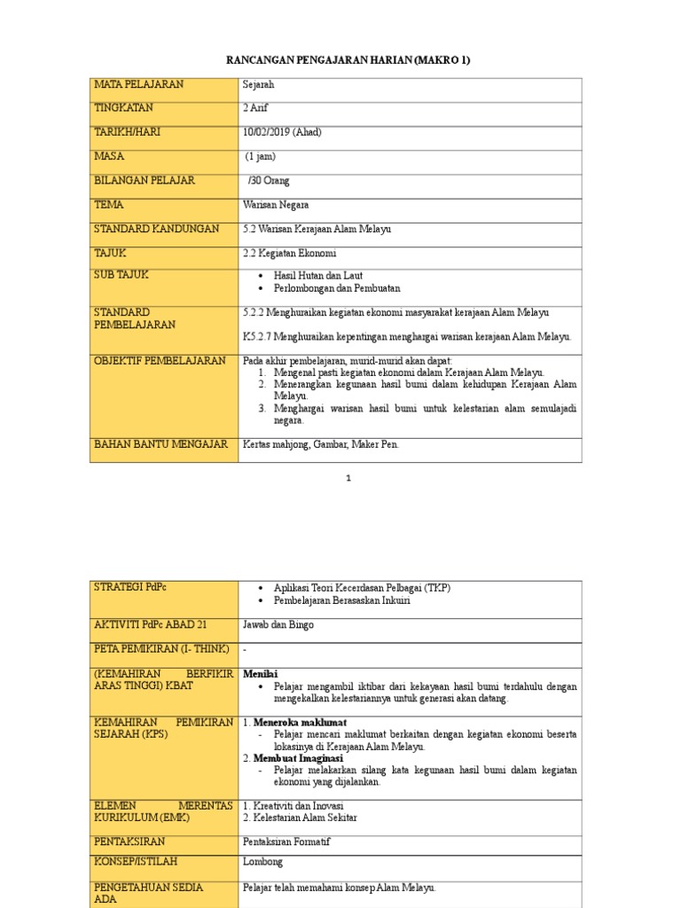 Rancangan Pengajaran Tahunan Sejarah Kssm Tingkatan 2 Tahun 2019