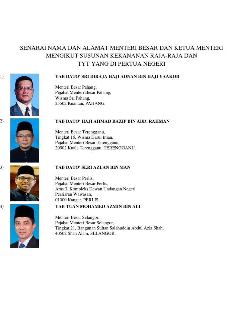 Senarai Nama Dan Alamat Menteri Besar Dan Ketua Menteri Mengikut Susunan Kekananan Raja
