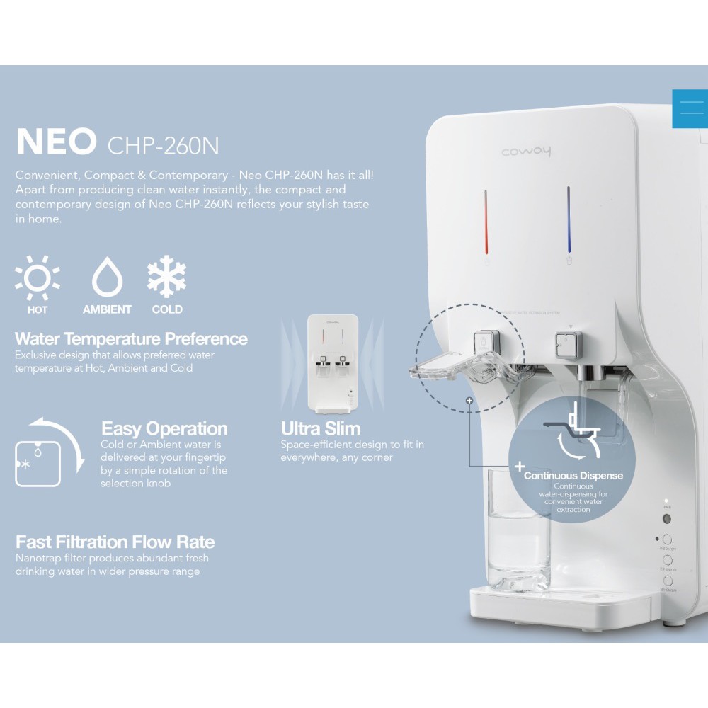 The neo is equipped with our innovative advanced filtration system called nanotrap. 260mm w 483mm d 500mm h features. 30 litre hour. Chp 260n coway water purifier innovative technology for any homehousehold essentialthe coway neo is equipped with our innovative advanced filtration system called nanotrap coway nanotrap filter systemthis innovative filter has a large surface area and contains nanofibre effectively reduces biofouling materials such as cell de.