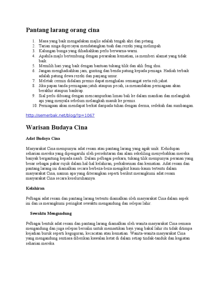 Adat Resam Dan Pantang Larang Kaum Cina Doc Document