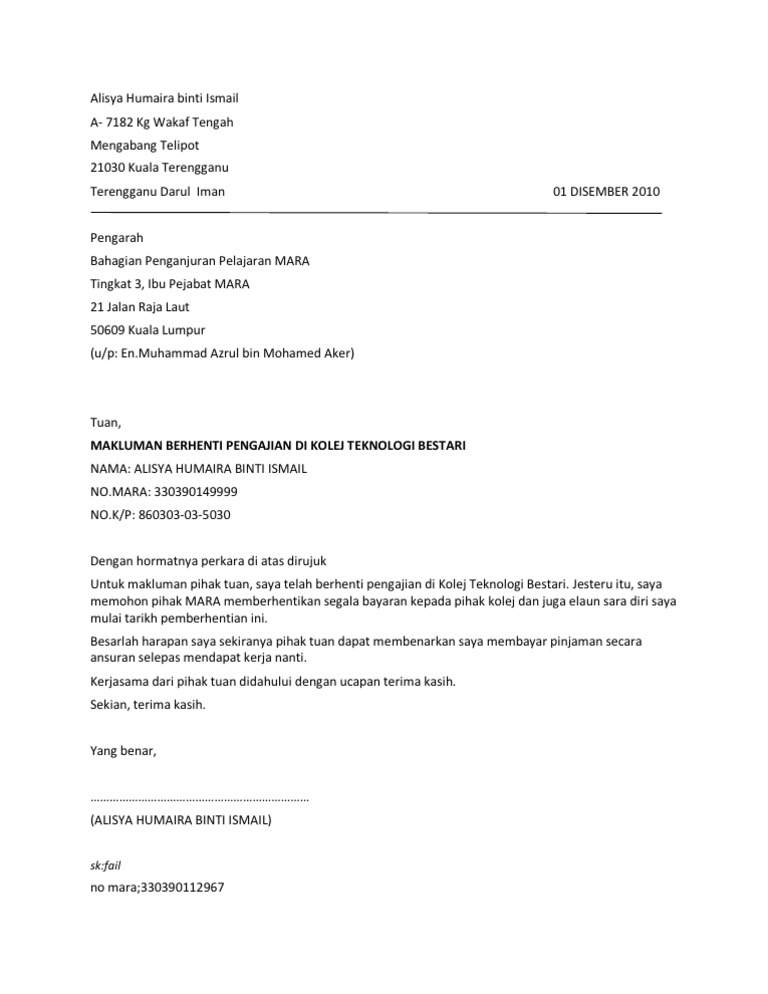 Contoh Surat Berhenti Mara