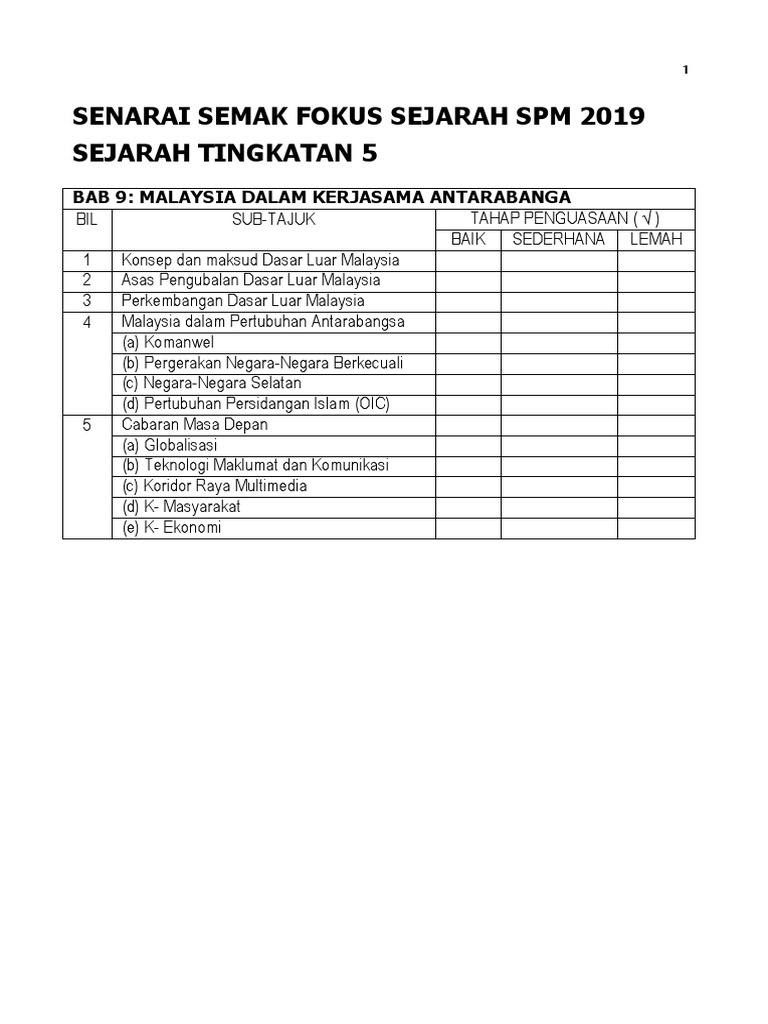 Senarai Semak Fokus Sejarah Spm 2019