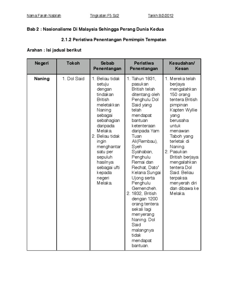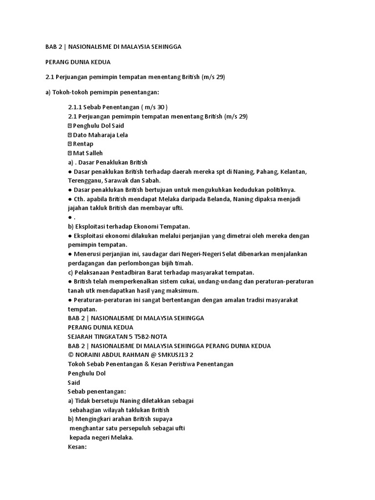 Nota Sejarah Tingkatan 5 Bab 2 Nasionalisme Di Malaysia Sehingga Perang Dunia Kedua