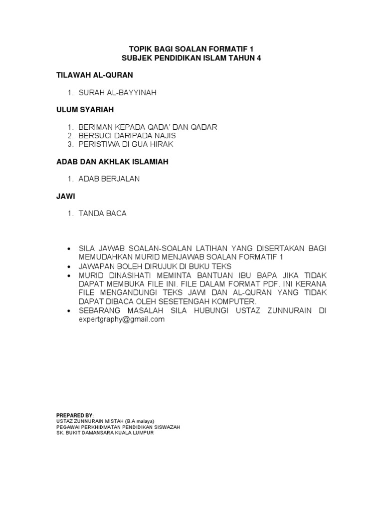 Topik Bagi Soalan Formatif 1 Subjek Pendidikan Islam Tahun 4 Tilawah Al Quran
