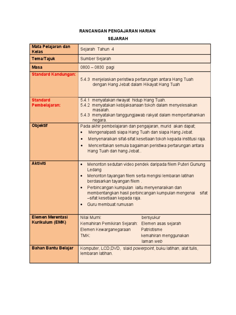 Rancangan Pengajaran Harian Tahun 4 Hang Tuah
